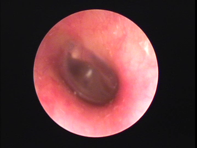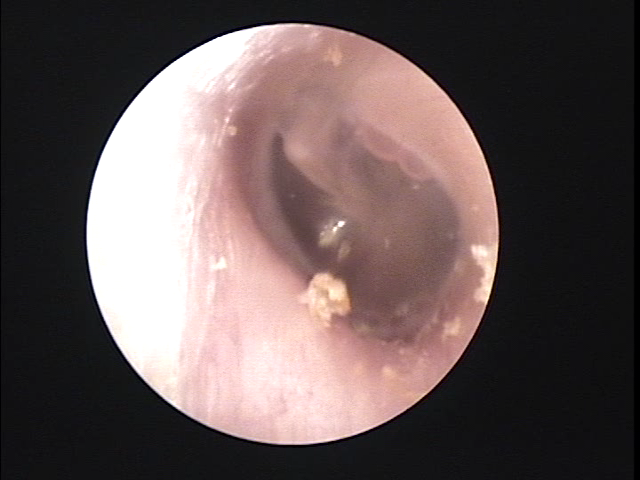 大きな軟らかい耳あかです。外耳道の下半分を占めていました。鼓膜が上半分しか見えません。上の方で白く見えるのはツチ骨の一部です。
