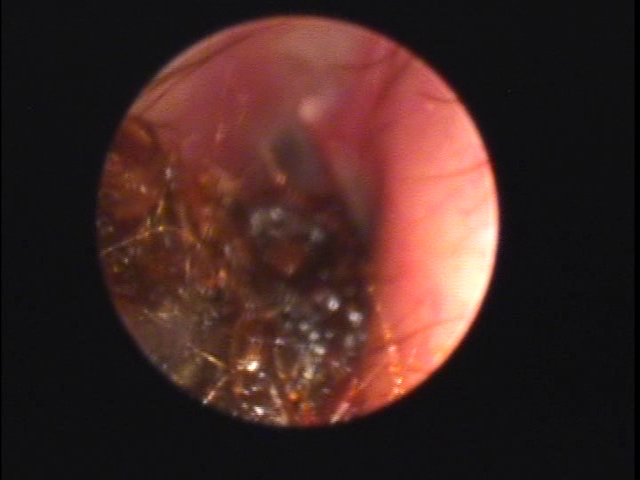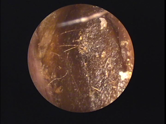 ガサガサと音がするとのことで、外耳道手前に薄く広く耳あかが付着していました。丁寧にはがして除去して症状は取れました。