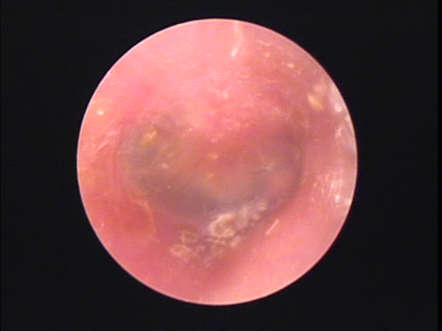 鼓膜のすぐ手前に大きな耳あかがあり、鼓膜半分が観察できません。