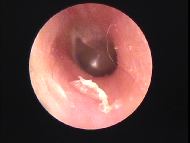 鼓膜に数多くの小さな耳あかが存在していました。生理食塩水で洗い流しながらすべて取り除きました。